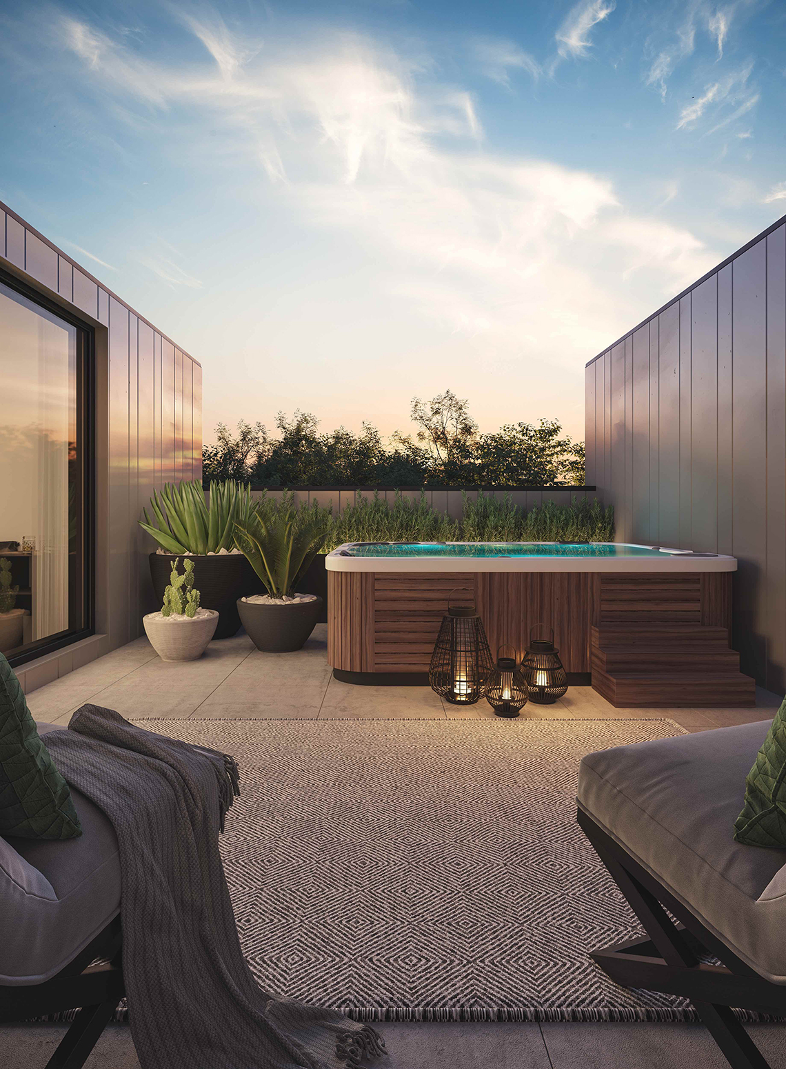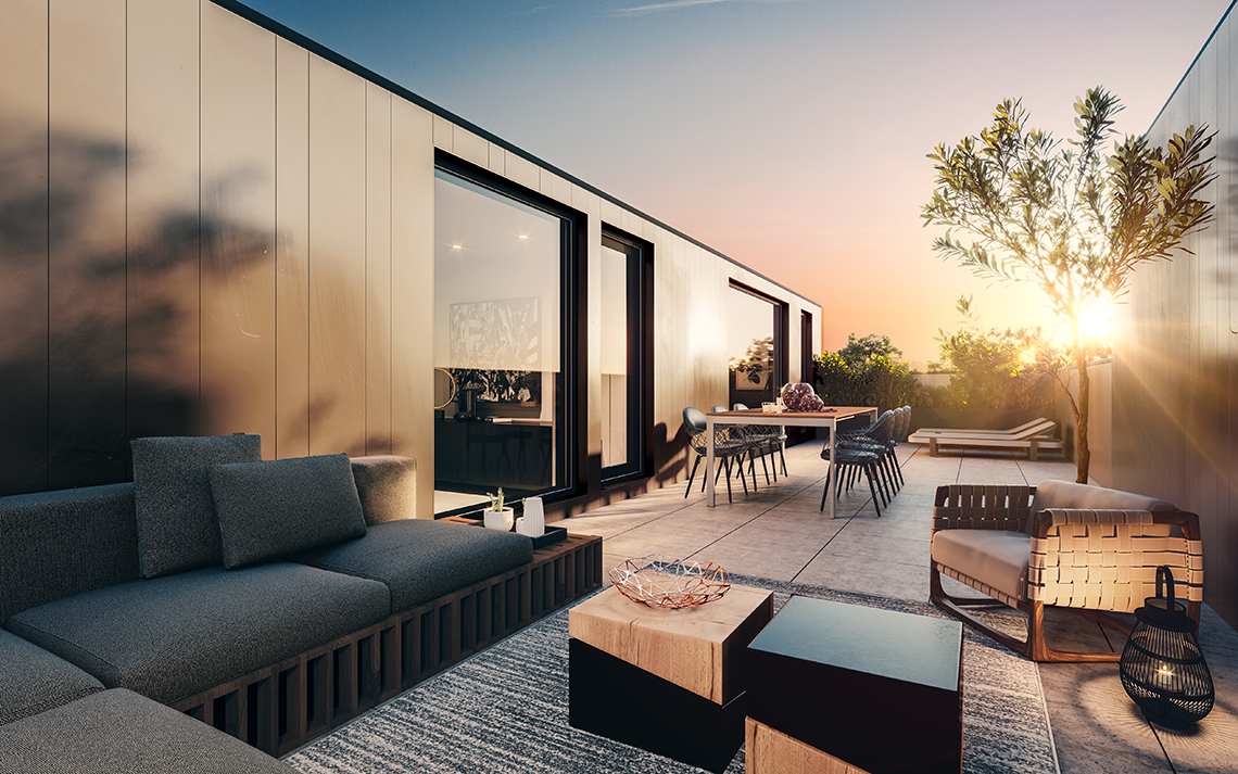 - Terrasse privée au toit pour les penthouses avec bacs de plantations.