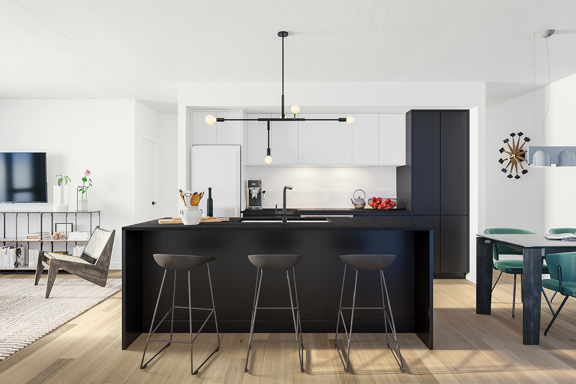 - Cabinets d’armoires en laque avec comptoir en quartz 3⁄4 de pouce.